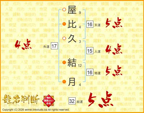 屋(9画)比(4画)久(3画) 結(12画)月(4画)