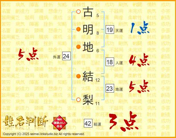 古(5画)明(8画)地(6画) 結(12画)梨(11画)