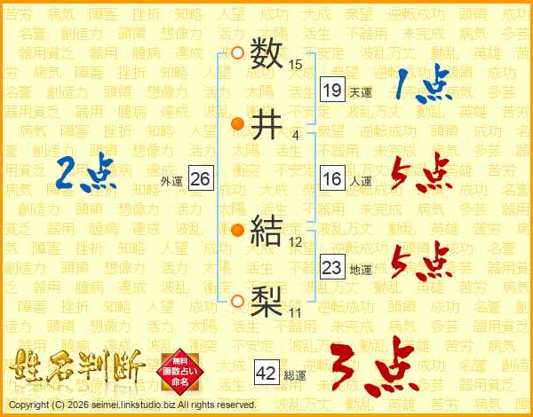 数(15画)井(4画) 結(12画)梨(11画)
