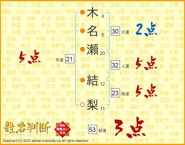 木(4画)名(6画)瀬(20画) 結(12画)梨(11画)