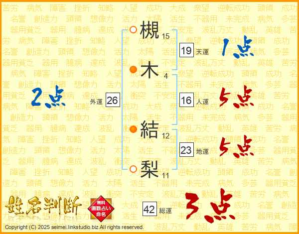 生活面を象徴する運勢です。外部から受ける影響力を表し、結婚運、家庭運や職場、環境への順応性を表します。総運から人運を引いた画数。姓や名が1文字の場合を除く。