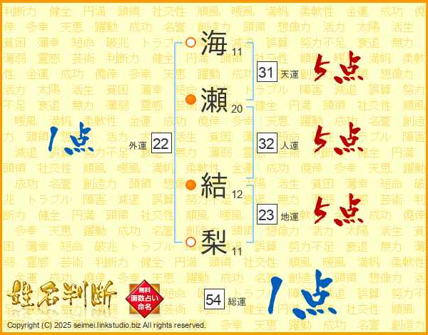 海(11画)瀬(20画) 結(12画)梨(11画)