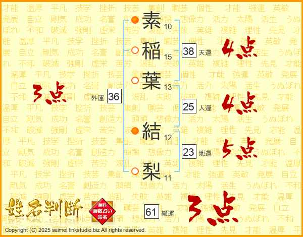 素(10画)稲(15画)葉(13画) 結(12画)梨(11画)