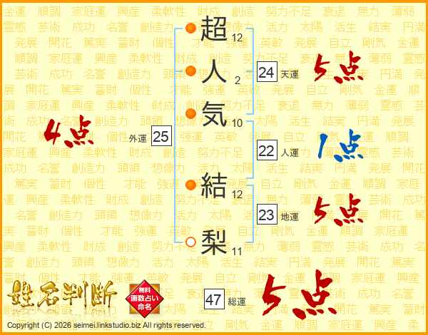 超(12画)人(2画)気(10画) 結(12画)梨(11画)