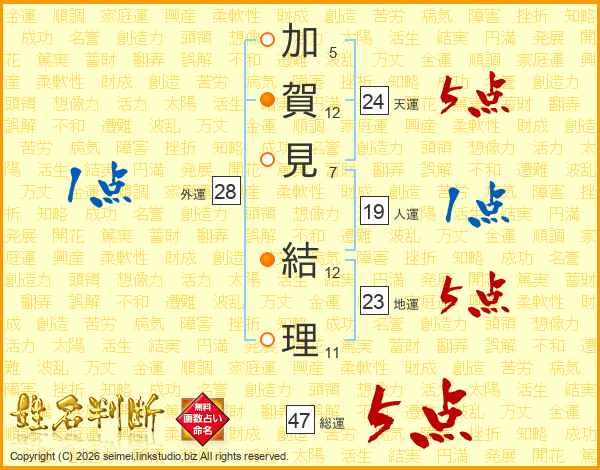 加(5画)賀(12画)見(7画) 結(12画)理(11画)