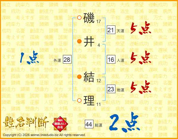 磯井結理さんの総運は44画の2点!