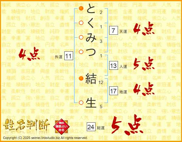 と(2画)く(1画)み(3画)つ(1画) 結(12画)生(5画)