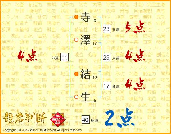 寺(6画)澤(17画) 結(12画)生(5画)