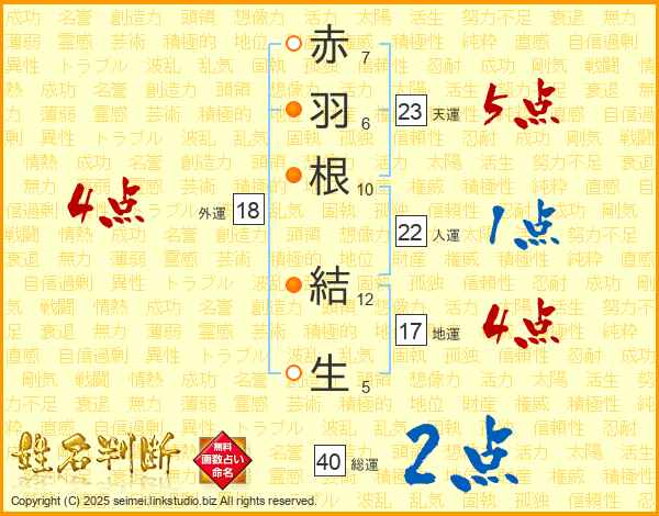 赤(7画)羽(6画)根(10画) 結(12画)生(5画)