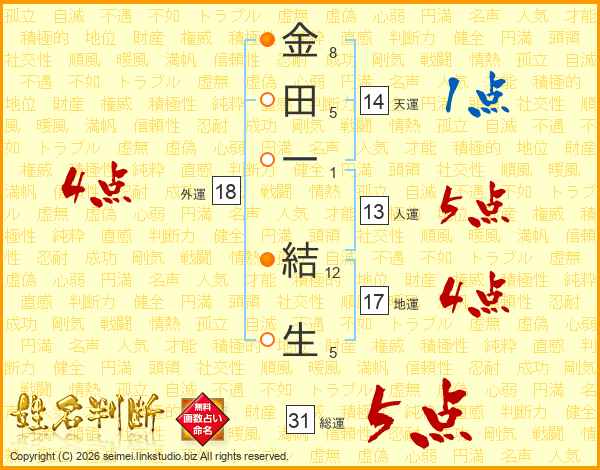 金(8画)田(5画)一(1画) 結(12画)生(5画)