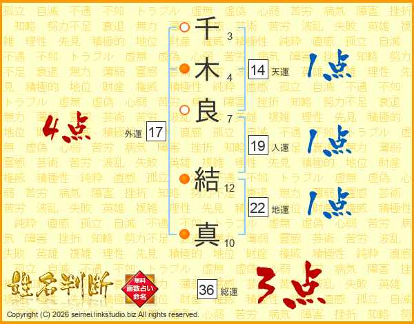 千(3画)木(4画)良(7画) 結(12画)真(10画)