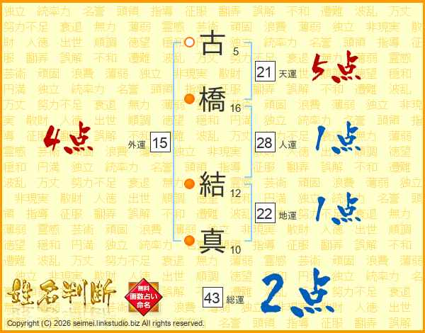 古(5画)橋(16画) 結(12画)真(10画)