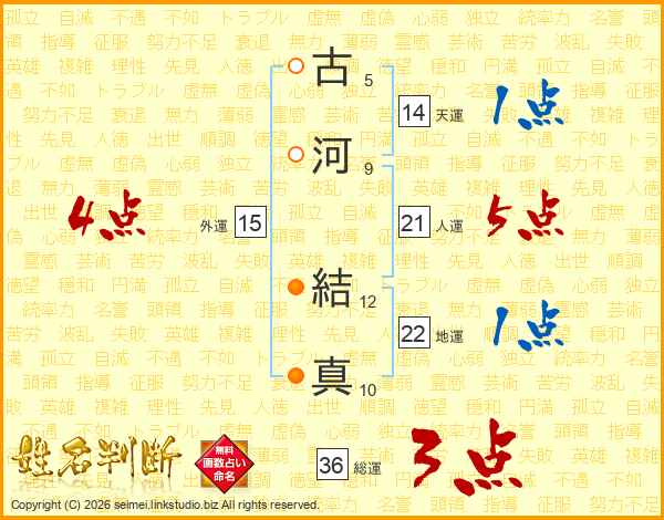 生活面を象徴する運勢です。外部から受ける影響力を表し、結婚運、家庭運や職場、環境への順応性を表します。総運から人運を引いた画数。姓や名が1文字の場合を除く。