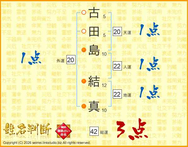 古(5画)田(5画)島(10画) 結(12画)真(10画)