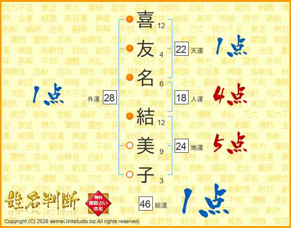 喜(12画)友(4画)名(6画) 結(12画)美(9画)子(3画)