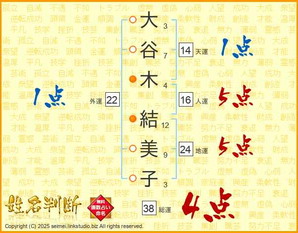 大(3画)谷(7画)木(4画) 結(12画)美(9画)子(3画)