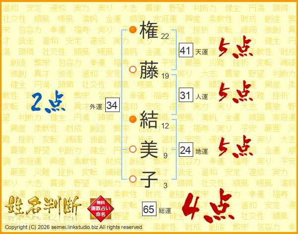 権(22画)藤(19画) 結(12画)美(9画)子(3画)