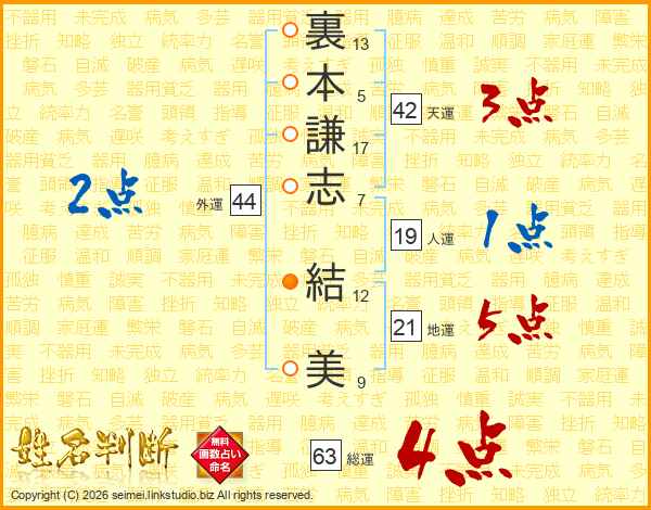裏本謙志結美さんの総運は63画の4点!