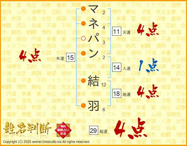 マ(2画)ネ(4画)パ(3画)ン(2画) 結(12画)羽(6画)