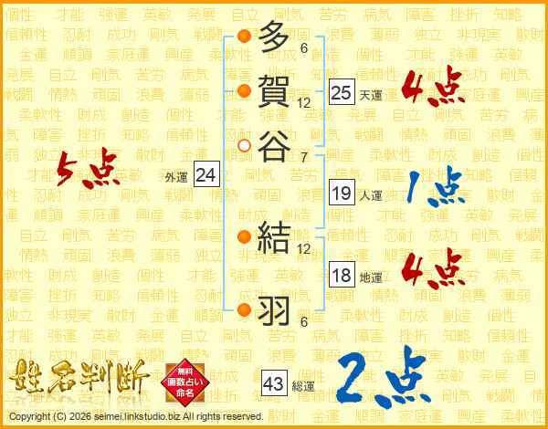 多(6画)賀(12画)谷(7画) 結(12画)羽(6画)