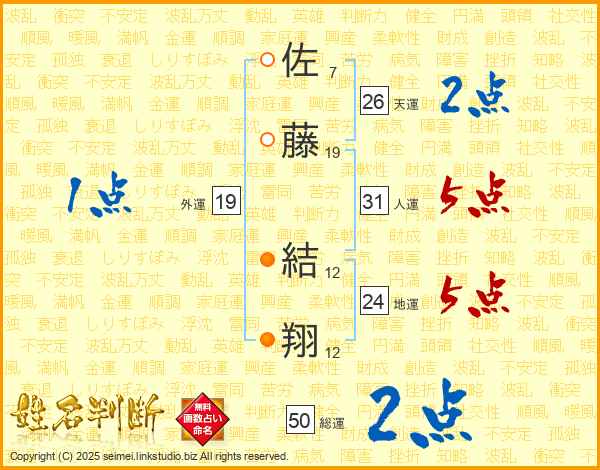 佐(7画)藤(19画) 結(12画)翔(12画)