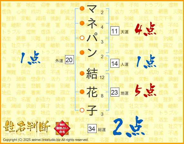 マ(2画)ネ(4画)パ(3画)ン(2画) 結(12画)花(8画)子(3画)