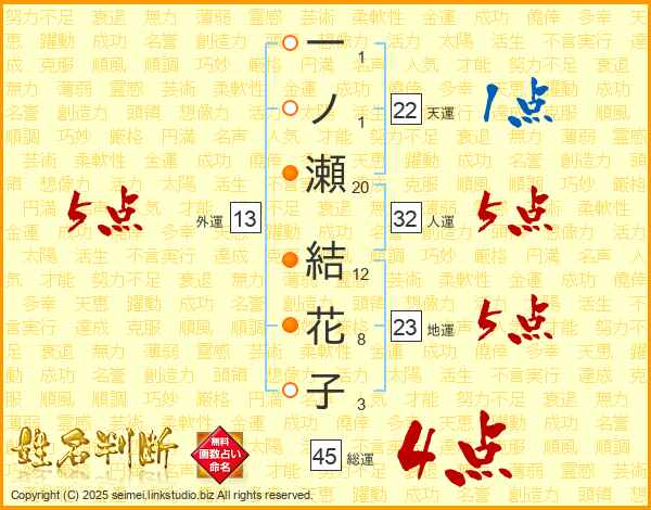 一(1画)ノ(1画)瀬(20画) 結(12画)花(8画)子(3画)