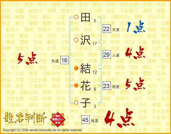 田(5画)沢(17画) 結(12画)花(8画)子(3画)