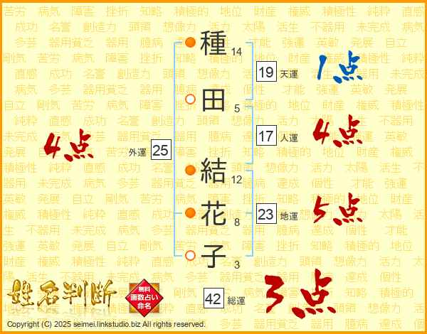 種(14画)田(5画) 結(12画)花(8画)子(3画)