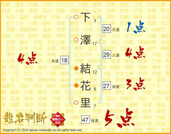 下(3画)澤(17画) 結(12画)花(8画)里(7画)