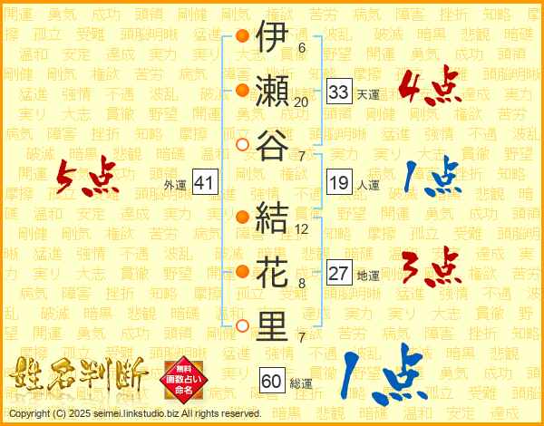 伊(6画)瀬(20画)谷(7画) 結(12画)花(8画)里(7画)