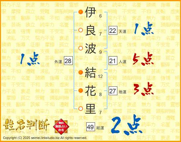 伊(6画)良(7画)波(9画) 結(12画)花(8画)里(7画)