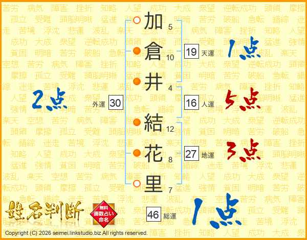 加(5画)倉(10画)井(4画) 結(12画)花(8画)里(7画)
