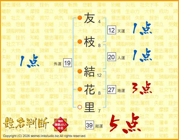 友枝結花里さんの総運は39画の5点!