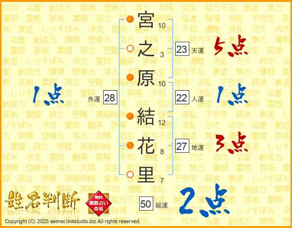 宮(10画)之(3画)原(10画) 結(12画)花(8画)里(7画)