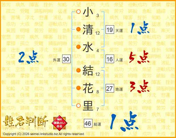 小(3画)清(12画)水(4画) 結(12画)花(8画)里(7画)