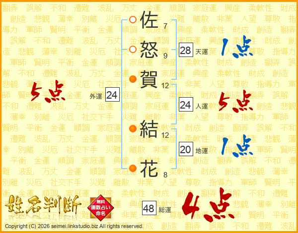 佐怒賀結花さんの総運は48画の4点!