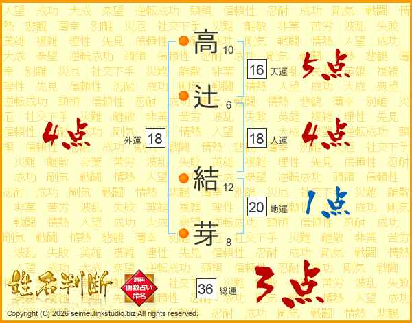 生活面を象徴する運勢です。外部から受ける影響力を表し、結婚運、家庭運や職場、環境への順応性を表します。総運から人運を引いた画数。姓や名が1文字の場合を除く。