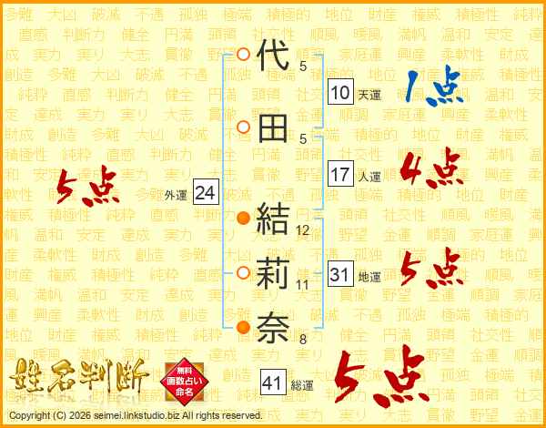 代(5画)田(5画) 結(12画)莉(11画)奈(8画)