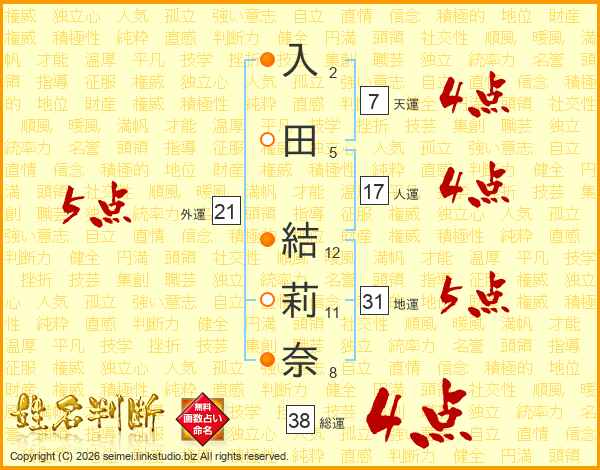 入(2画)田(5画) 結(12画)莉(11画)奈(8画)