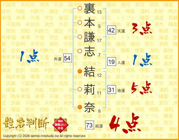裏(13画)本(5画)謙(17画)志(7画) 結(12画)莉(11画)奈(8画)