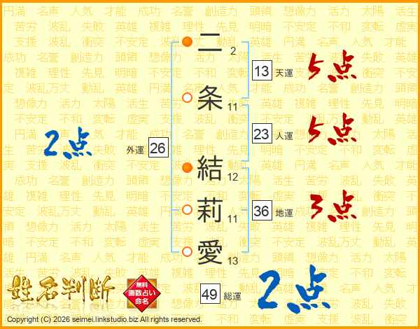 二(2画)条(11画) 結(12画)莉(11画)愛(13画)