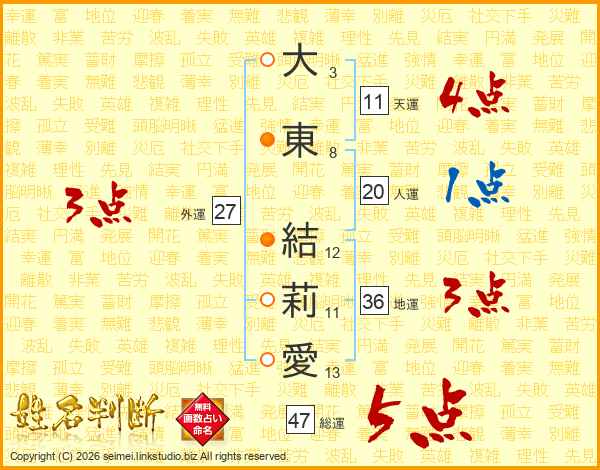 大(3画)東(8画) 結(12画)莉(11画)愛(13画)