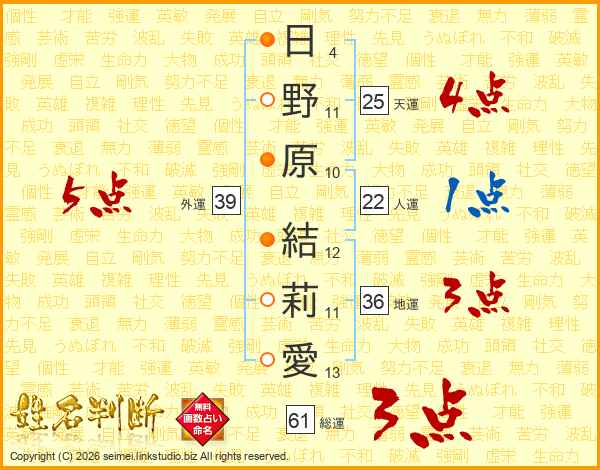 日(4画)野(11画)原(10画) 結(12画)莉(11画)愛(13画)