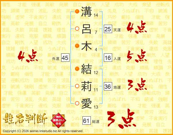 溝(14画)呂(7画)木(4画) 結(12画)莉(11画)愛(13画)