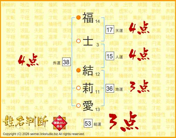 福(14画)士(3画) 結(12画)莉(11画)愛(13画)