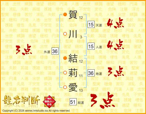 賀(12画)川(3画) 結(12画)莉(11画)愛(13画)