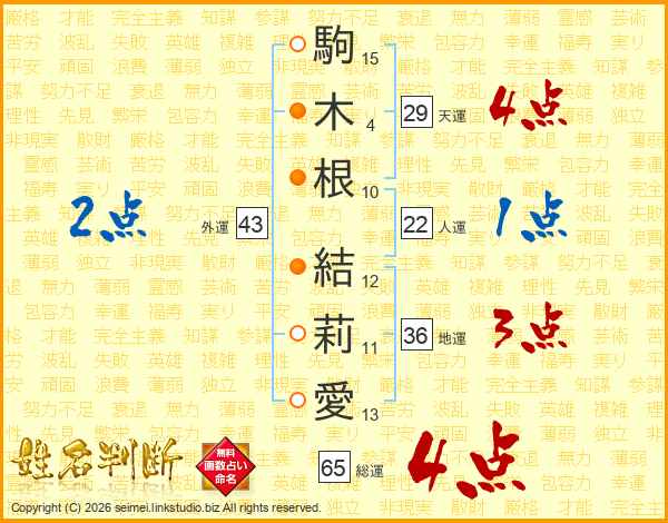駒(15画)木(4画)根(10画) 結(12画)莉(11画)愛(13画)