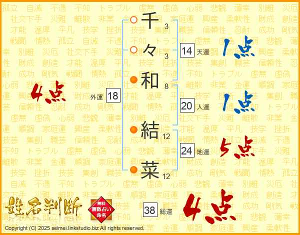 千(3画)々(3画)和(8画) 結(12画)菜(12画)