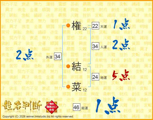 生活面を象徴する運勢です。外部から受ける影響力を表し、結婚運、家庭運や職場、環境への順応性を表します。総運から人運を引いた画数。姓や名が1文字の場合を除く。